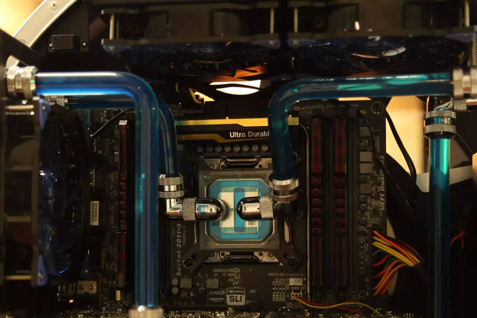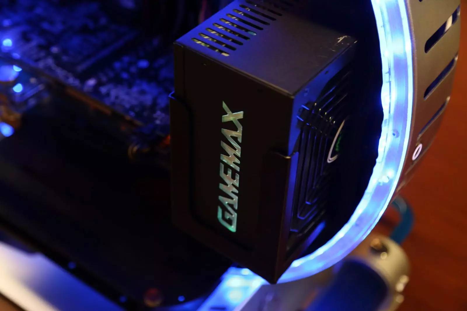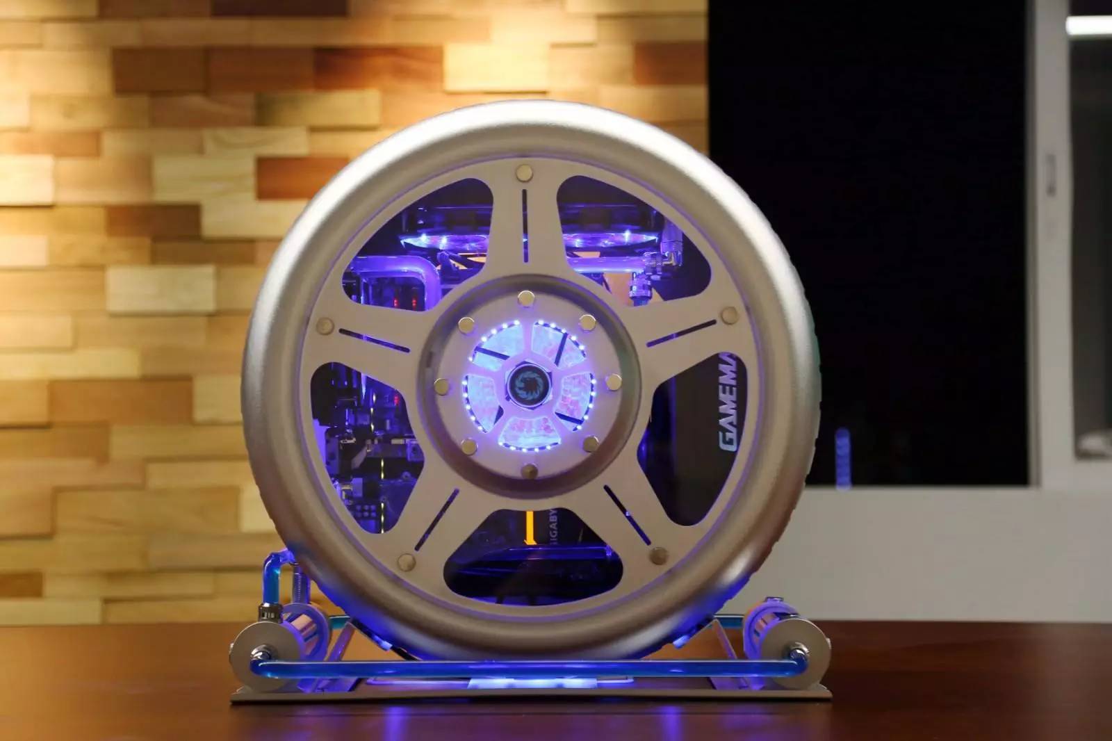 盖上外盖,LED风扇与水冷的蓝色光芒透过五辐条式轮辋显现出来。