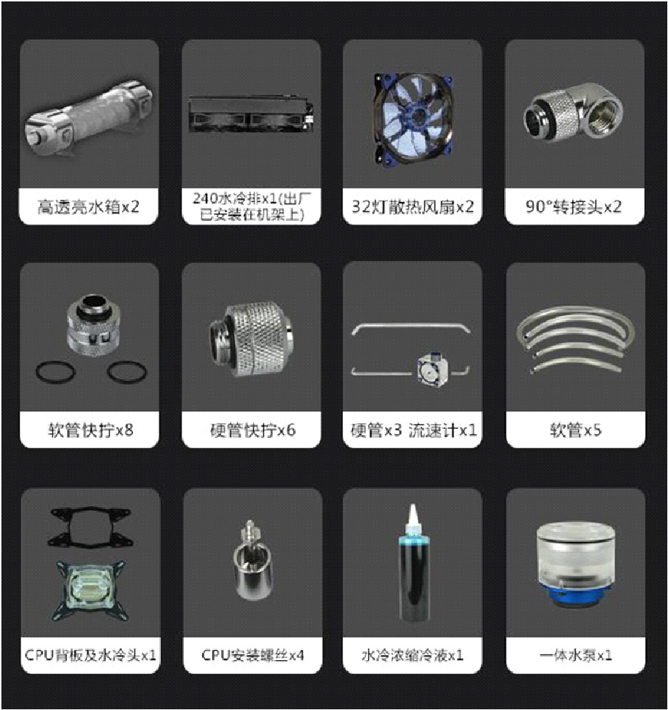 风火轮二代机箱延续了一代定制化水冷散热的策略,解决了玩家不会安装水冷散热系统的问题。风火轮二代水冷机箱的定制水冷套装包括了2个高透亮水箱、预装好的240mm水冷排、2个32灯散热风扇、2个90度转接头、8个软管快拧、6个硬管快拧、3根硬管和1个流速计,此外还有5根软管、1个CPU背板及水冷头、4个CPU安装螺丝、1瓶水冷浓缩液和1个一体式水泵。风火轮二代机箱出厂时已经完成了大部分水冷套件的安装,机箱内部采用了定制一体式水冷散热,机箱外部则提供了预装的定制分体式水冷散热,包括2个螺旋式水冷箱和带有流速仪的水冷管道。玩家只需在水冷散热的分体式部分接上接头,一体式部分装上水泵即可。